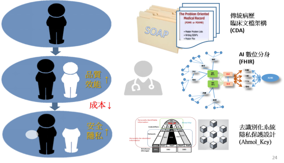 整合及分析各種生活與醫療數據,可利用AI生成照護計畫,建立民眾的數位孿生 (虛擬分身),當就醫時就可以提供醫事人員參考,提供客製化的照護指引,包括用藥、檢驗檢查、診斷、社交陪伴,以及提供聊天、對話、關懷、衛教及提醒等功能。但這一切的前提,是建立在個人能掌控自己數位權限,否則隱私保護將受到極大威脅,AI 用在自己身上也會令人卻步。